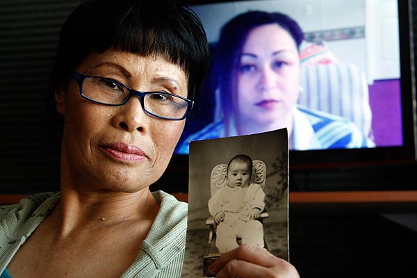 ![]() Sally Blue was missing for 37 years until she was reunited with her biological family via a Facebook page set up by her brother, Steve Inman. This photo of Sally as a baby was on the page. Image courtesy of Los Angeles Times ![]() Diane Drinkwine, whose maiden name was Chum Ku Yi, holds a baby photo of her biological daughter, Sally Blue, who appears in the background on Skype. Drinkwine and her other daughter, Connie Files, along with her son, Steve Inman, were reunited with Sally after Sally’s daughter spotted a Facebook page posted by Steve in hopes of finding his long-lost sister after 37 years. Image courtesy of Gary Friedman / Los Angeles Times |